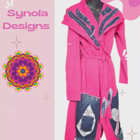 Custom made fushia cardigan with denim material upcycled. Size small. Will fit a medium.